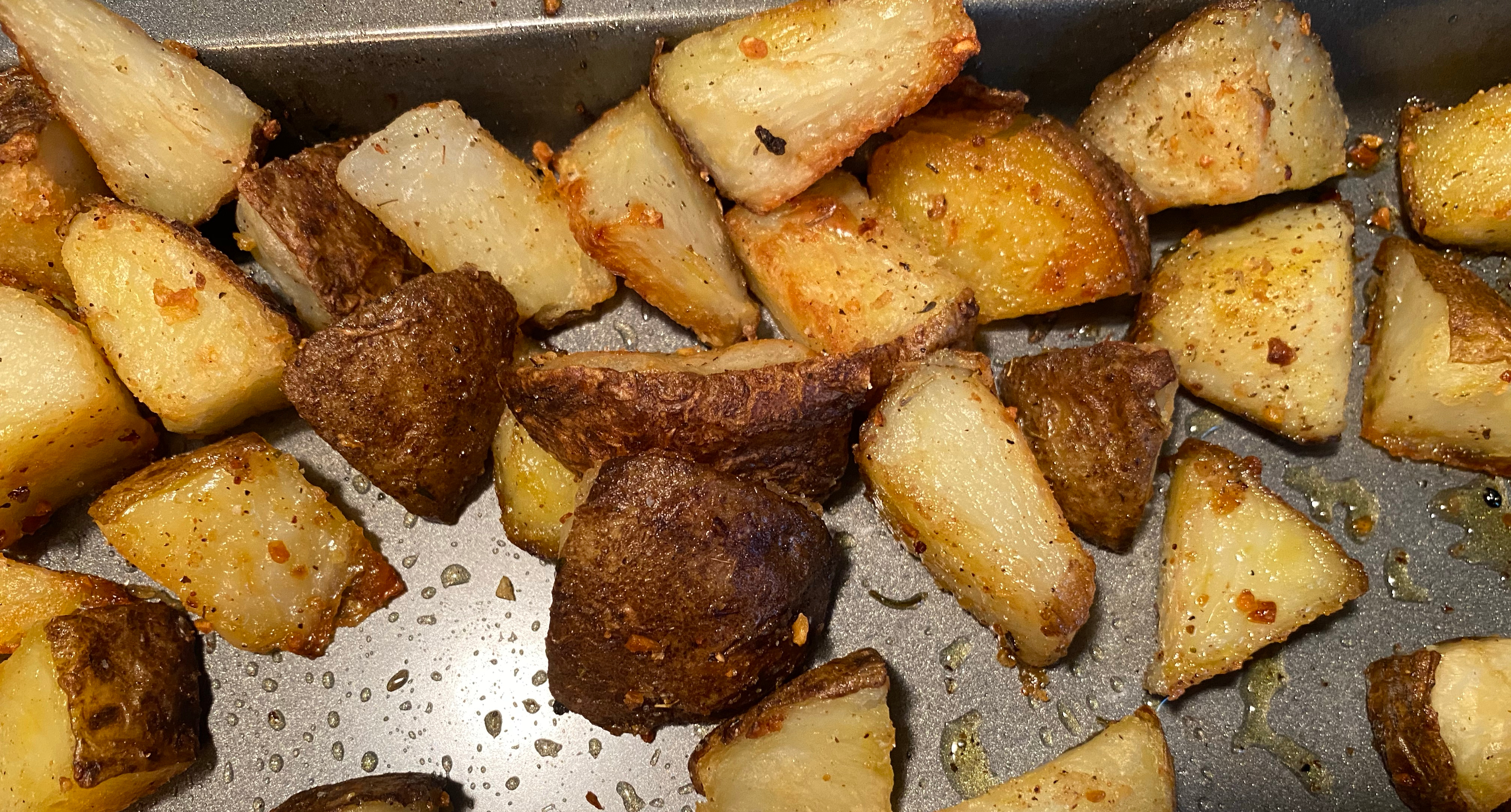 - Drain and place potatoes on a baking sheet with 2 tbsp drizzled with olive oil.
